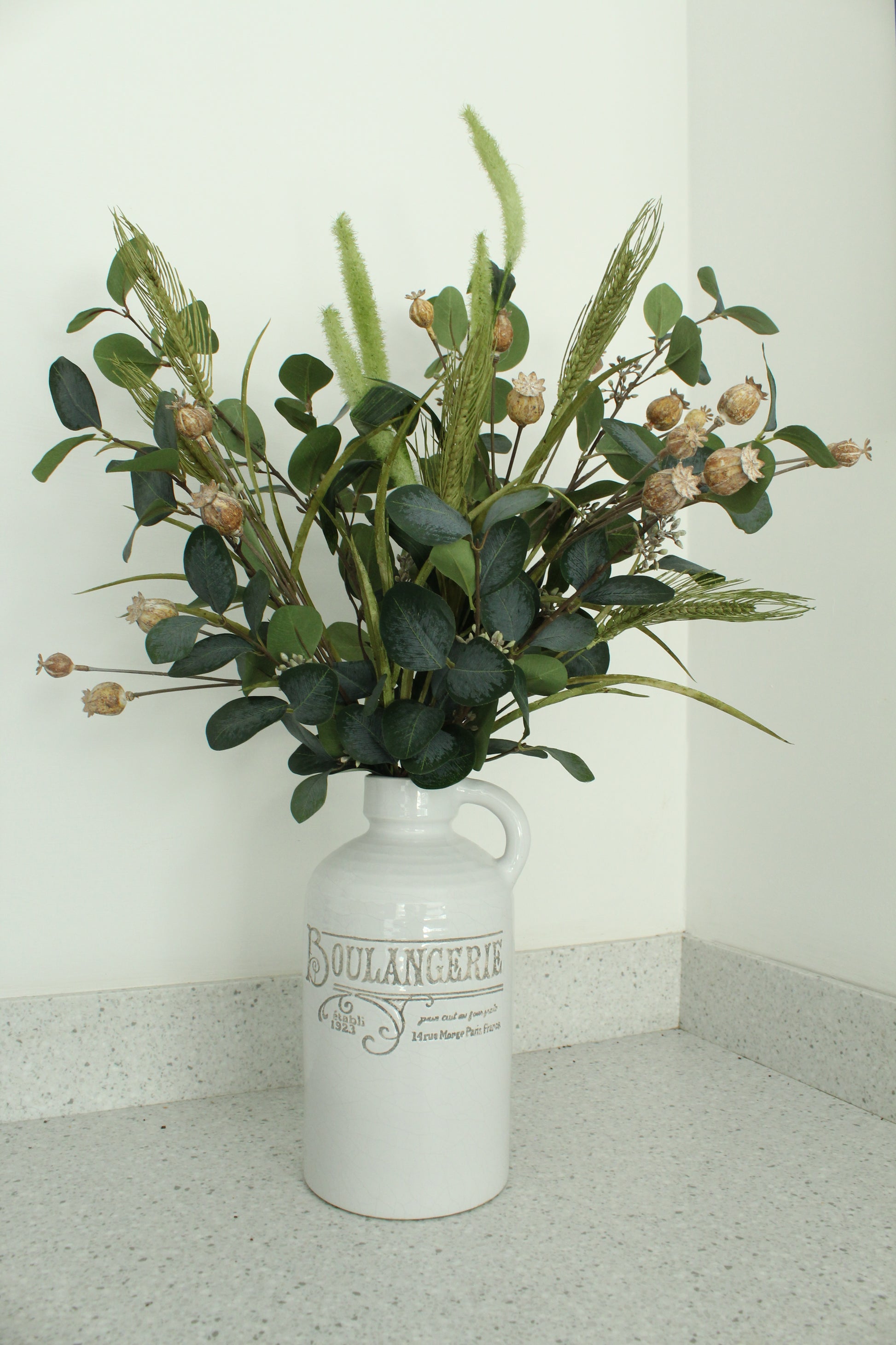 A Lush green foliage bouquet with added texture of faux wheat stems and faux dried poppy seed sprays.